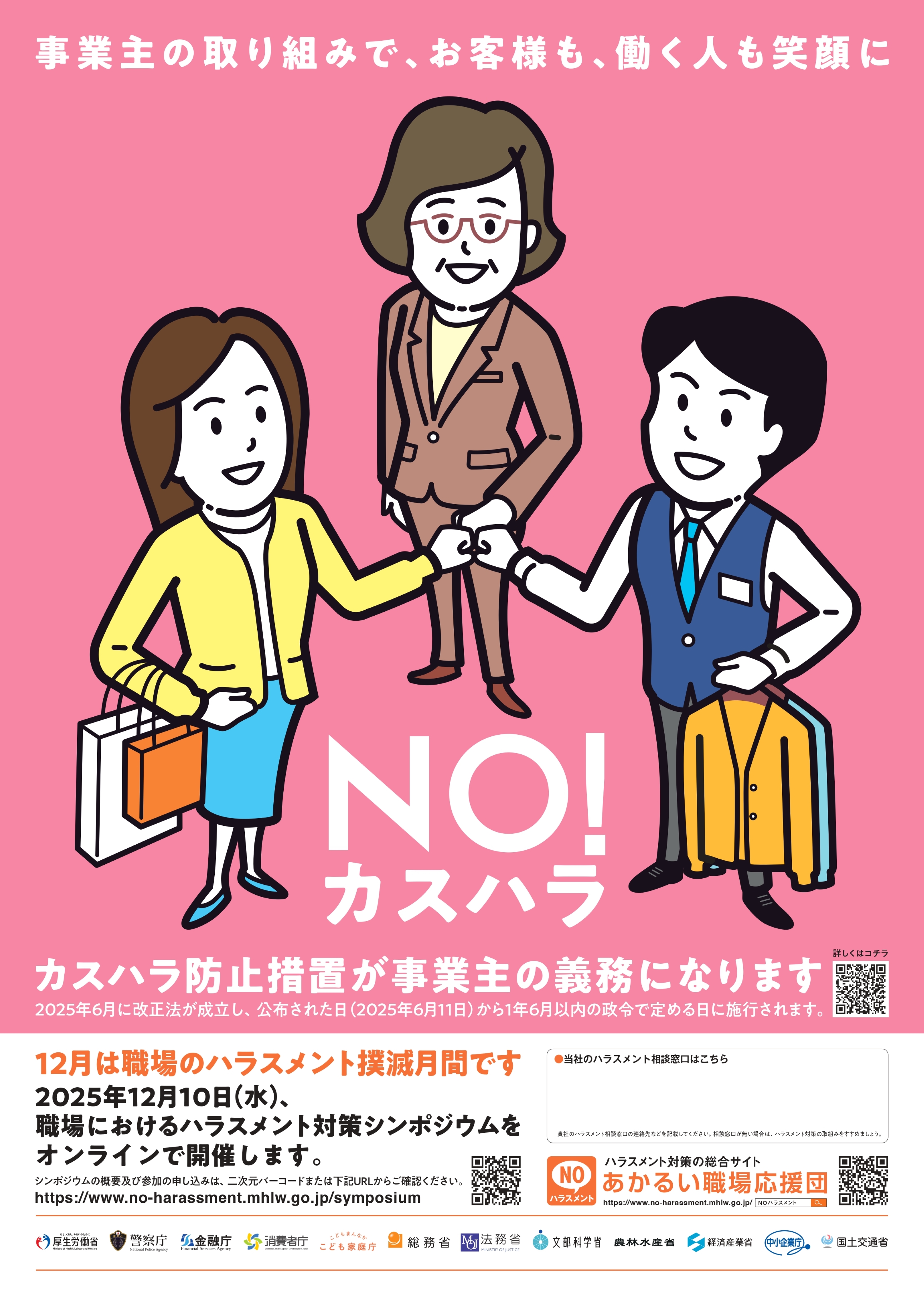今年6月に労働施策総合推進法等の一部改正法が公布され、すべての事業者に「カスタマーハラスメント対策」と「求職者等に対するセクハラ(いわゆる「就活セクハラ」)対策」が義務付けられることになっています。(施行日は未定)