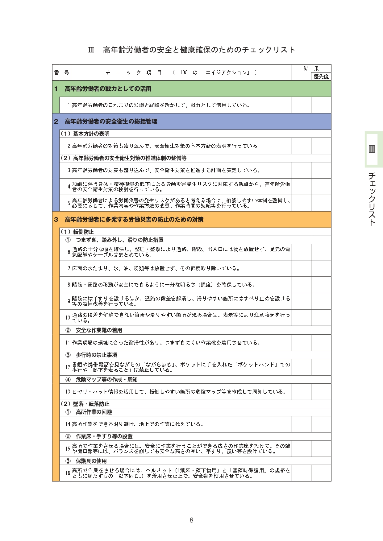 特に、まずどのようなリスクがあるかを調べ、優先度を考える材料として「エイジアクション100」というチェックリストがあります。こちらも活用できるかと思います。