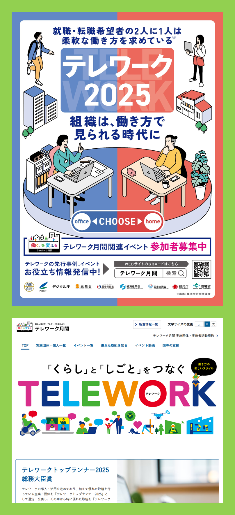 政府では、時間や場所を有効に活用できる柔軟な働き方であるテレワークの積極的な実践をお願いします。