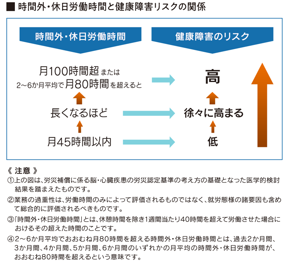 リーフレットでは「時間外・休日労働時間と健康障害リスクの関係」と題して、月100時間超または2~6か月平均で月80時間を超えると、健康障害のリスクが高まることが示されています。