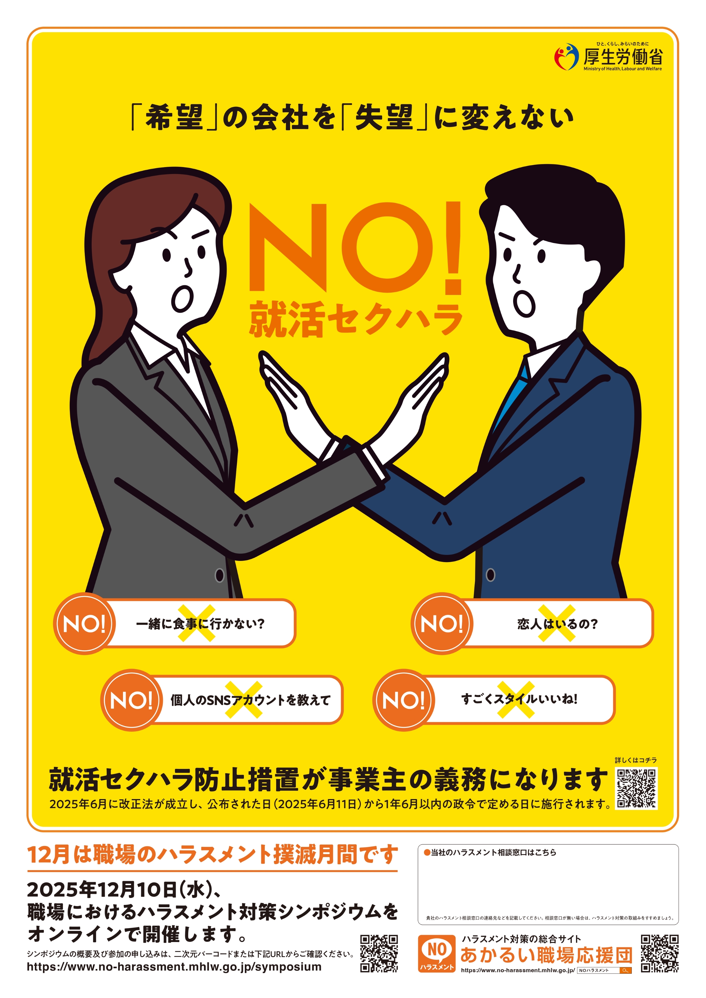 今年6月に労働施策総合推進法等の一部改正法が公布され、すべての事業者に「カスタマーハラスメント対策」と「求職者等に対するセクハラ(いわゆる「就活セクハラ」)対策」が義務付けられることになっています。(施行日は未定)