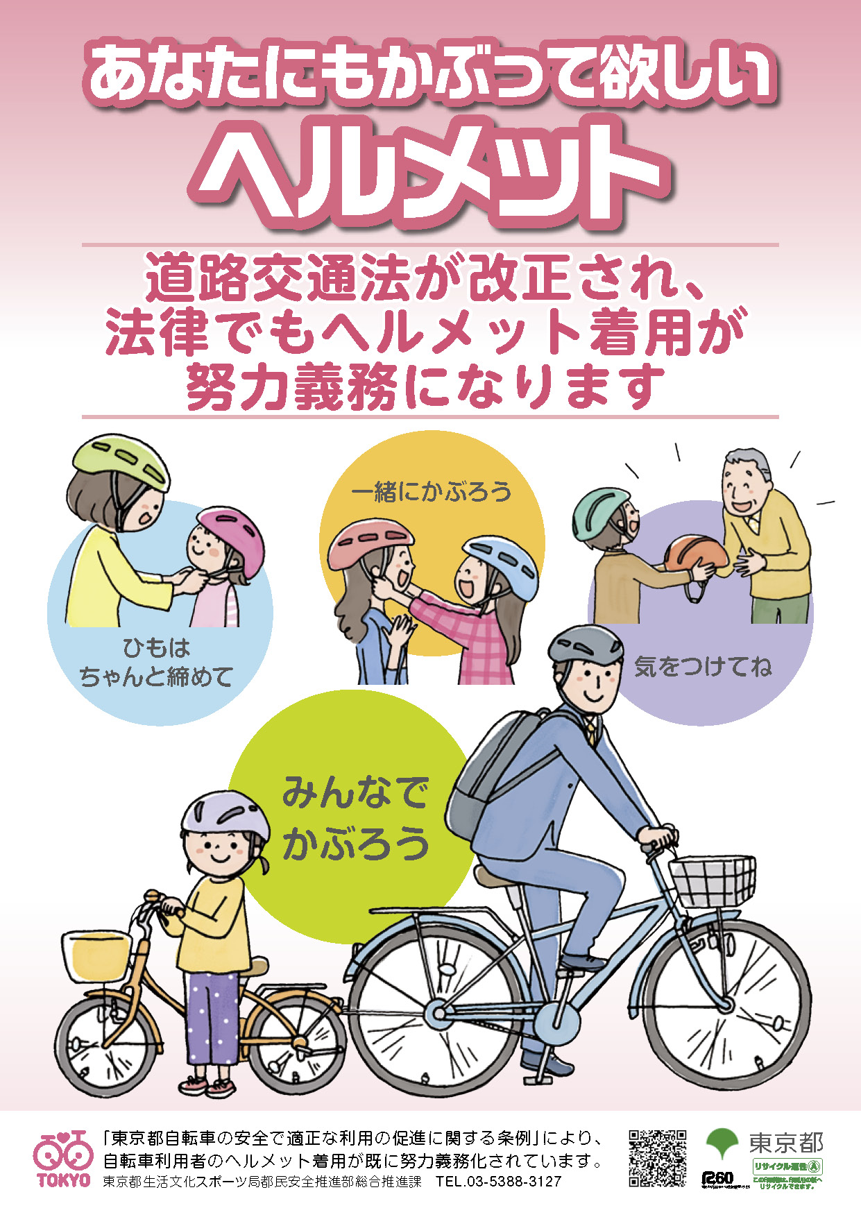道路交通法の改正により、4月1日から、全年齢の自転車利用者にヘルメット着用が努力義務化されます。